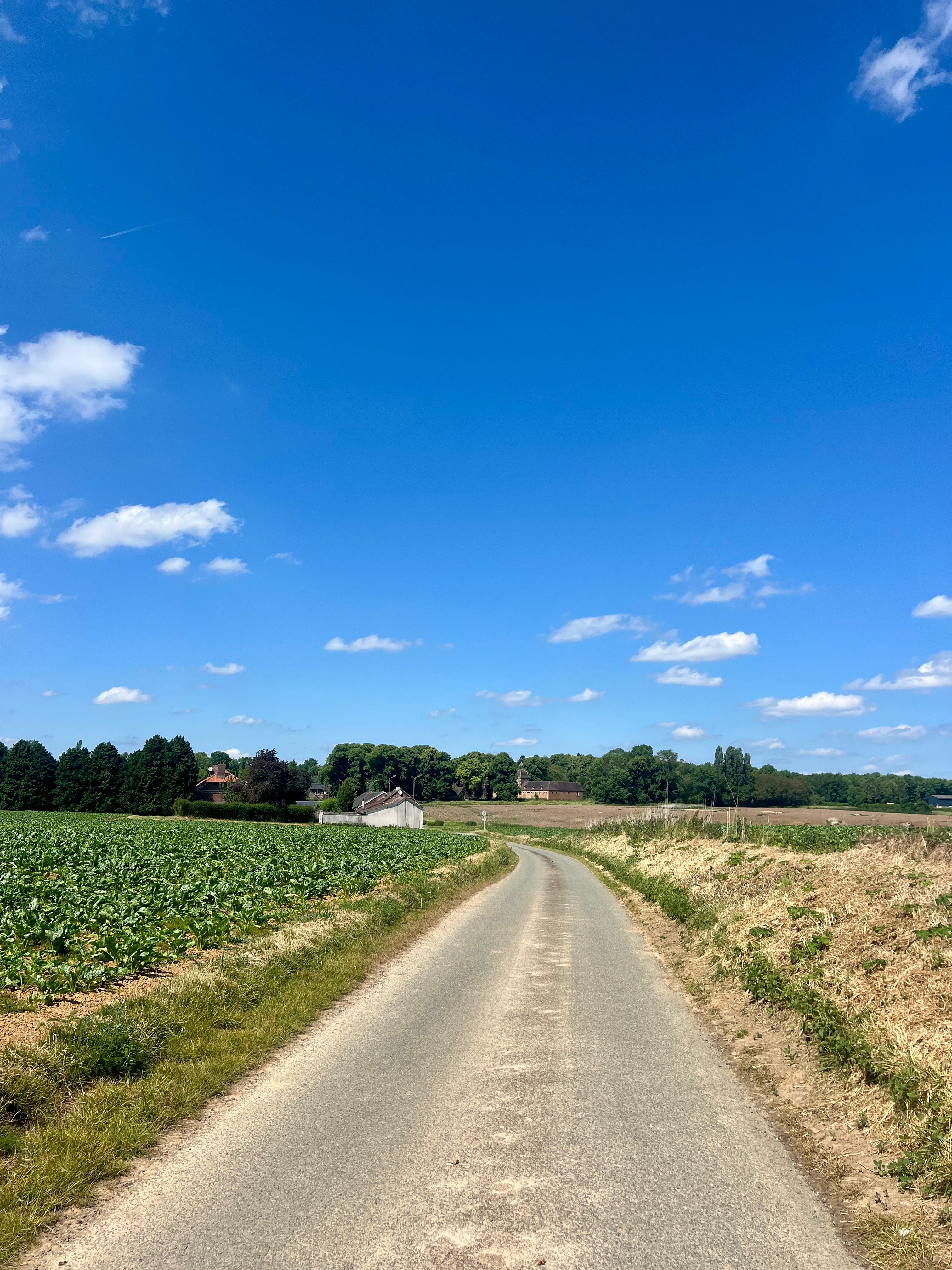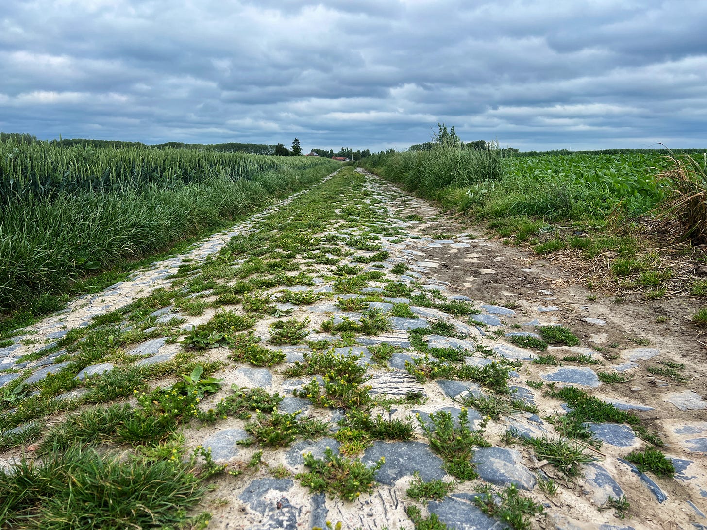 Hier ergens moet een weg met kasseien liggen. Of in mijn beste Frans ‘secteur pavé’. Ik weet nog steeds niet of de bewuste kasseienstrook in de wielerklassieker Parijs-Roubaix voorkomt, het gaat mij vooral om het idee.