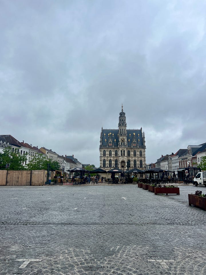 Na een dag stoempen zit ik ’s avonds aan een bord stevige kost in de Noord-Franse stad Douai. Iets anders is er ook niet te krijgen.